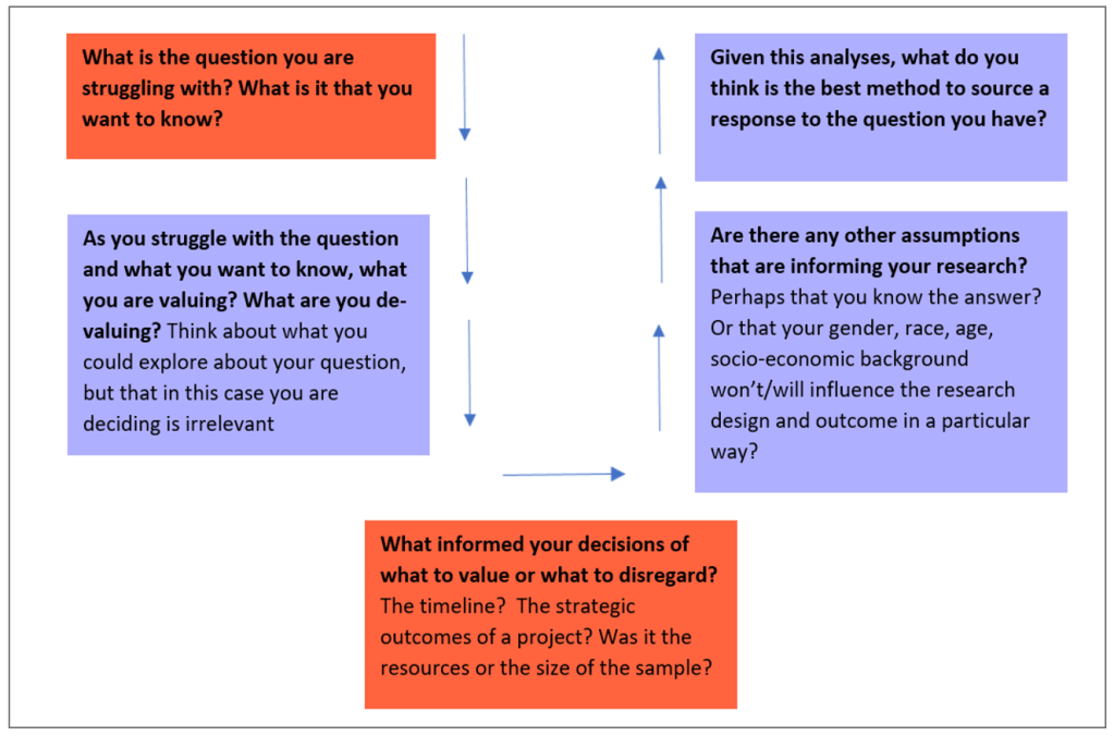 If you are interested in exploring the assumptions and values that situate your research, consider using the following framework. Engaging in these questions with individuals who work in a different sector to you, or who have a different lived experience, will provide you with the most insight. Enjoy!